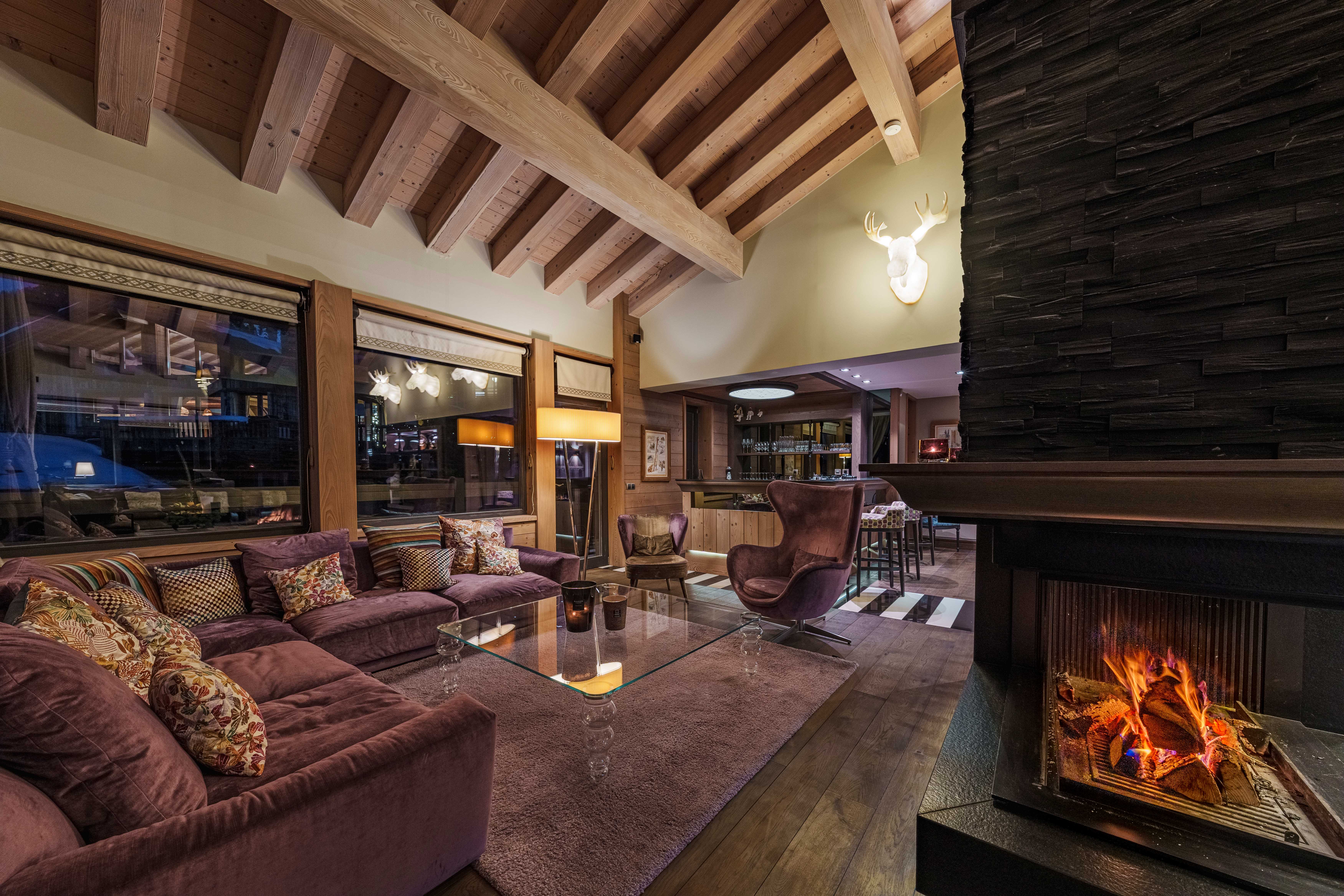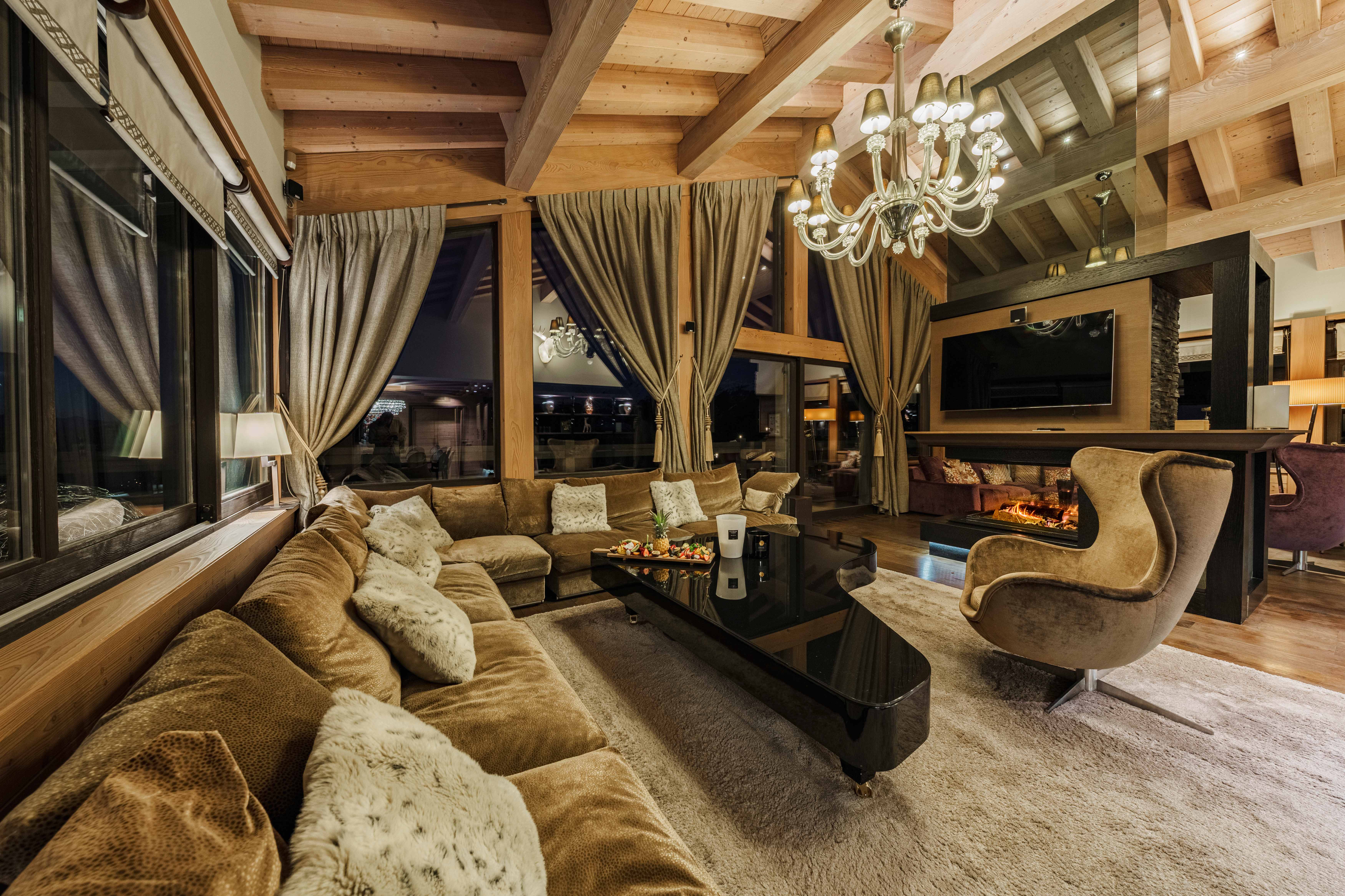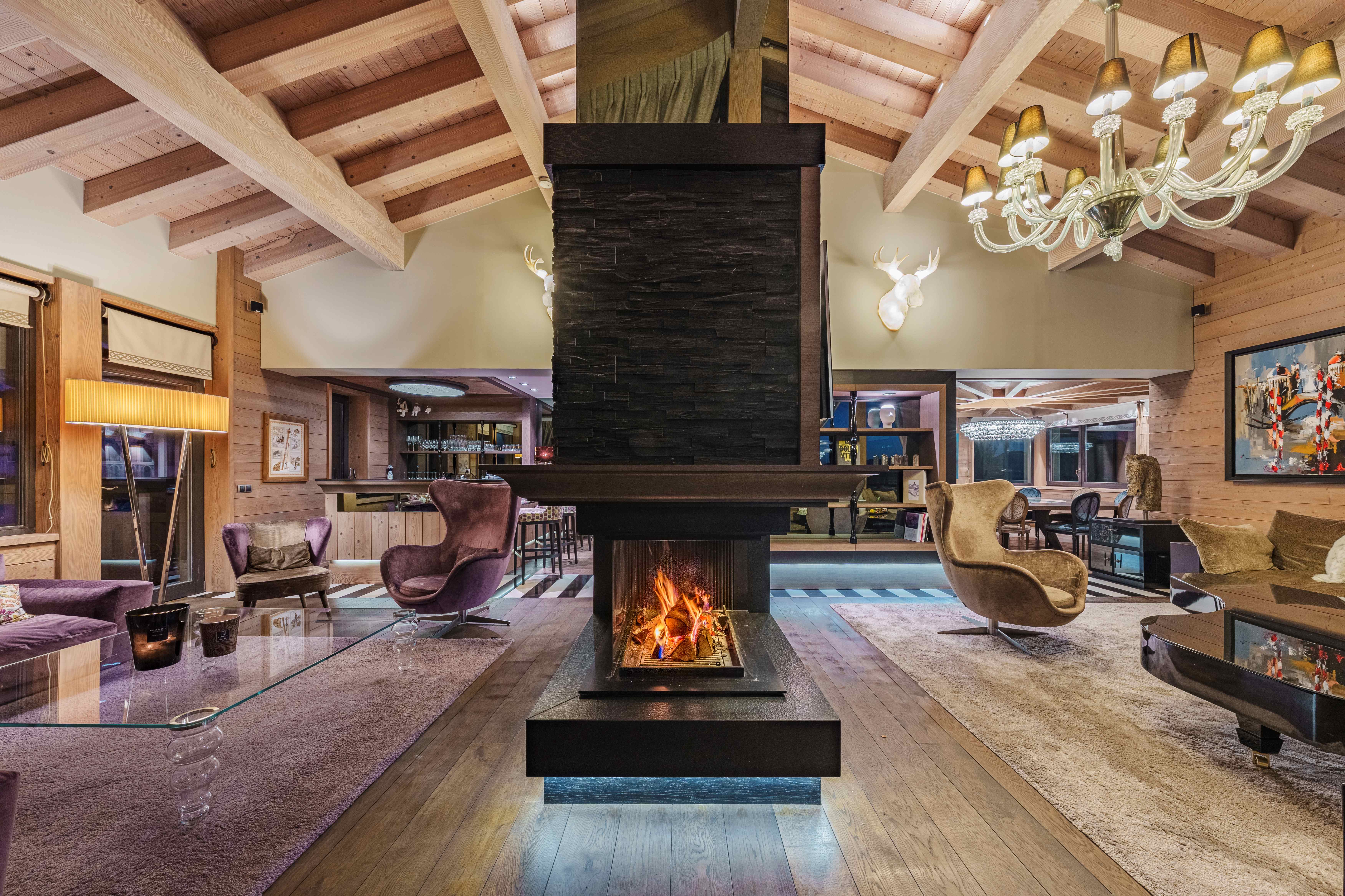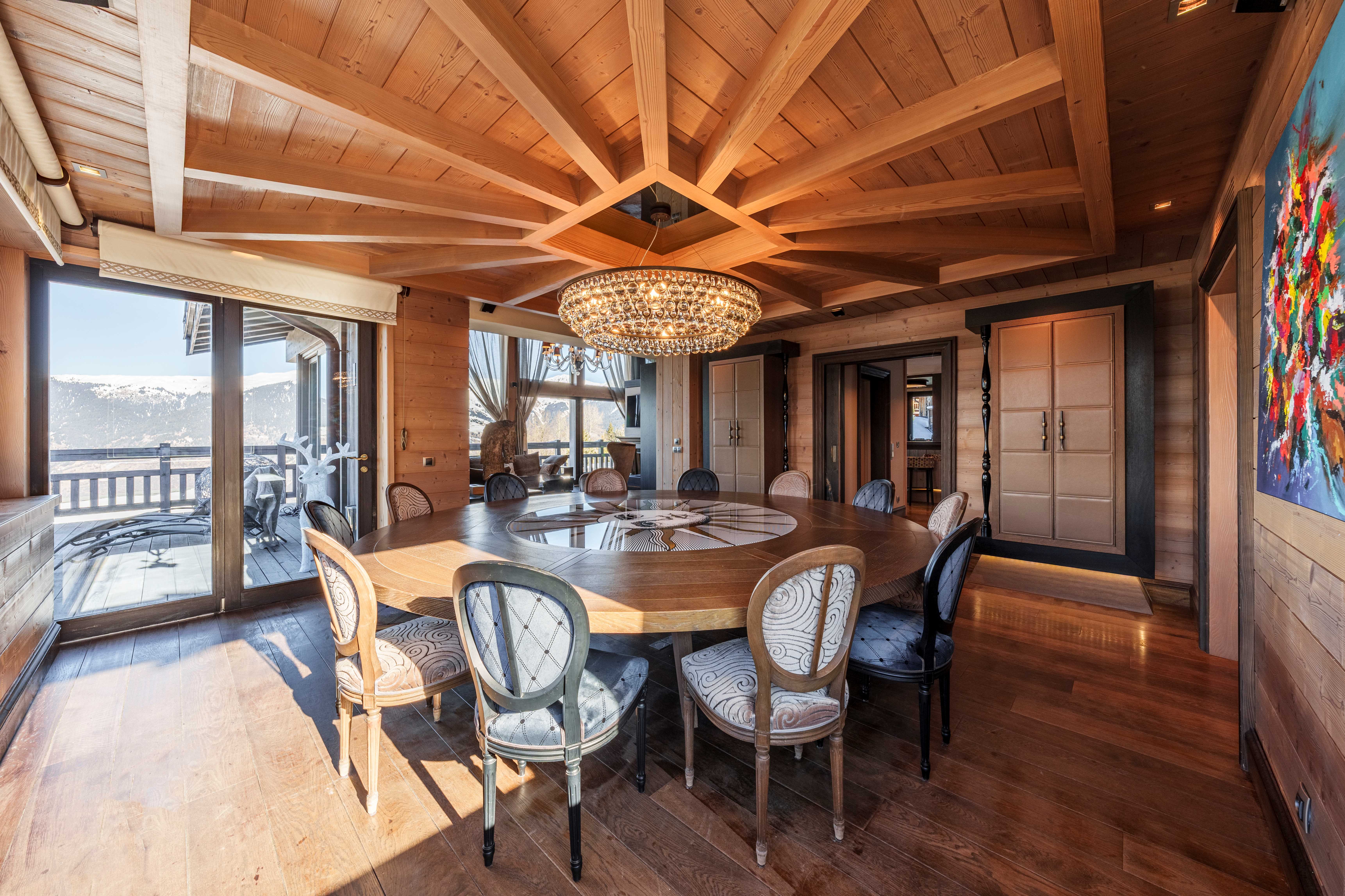 On this level, an expansive living area flows into a cozy double lounge, where a central fireplace fosters a welcoming ambiance, complemented by a television that enhances comfort. The large bay windows provide a stunning view of the valley and the enchanting spectacle of the setting sun, illuminating the room with natural light. A bar area, adorned with a wine cellar, encourages relaxation and conviviality. The fully equipped professional kitchen will satisfy culinary enthusiasts. The elegant dining room features a round table that can seat up to 14 guests for unforgettable meals.