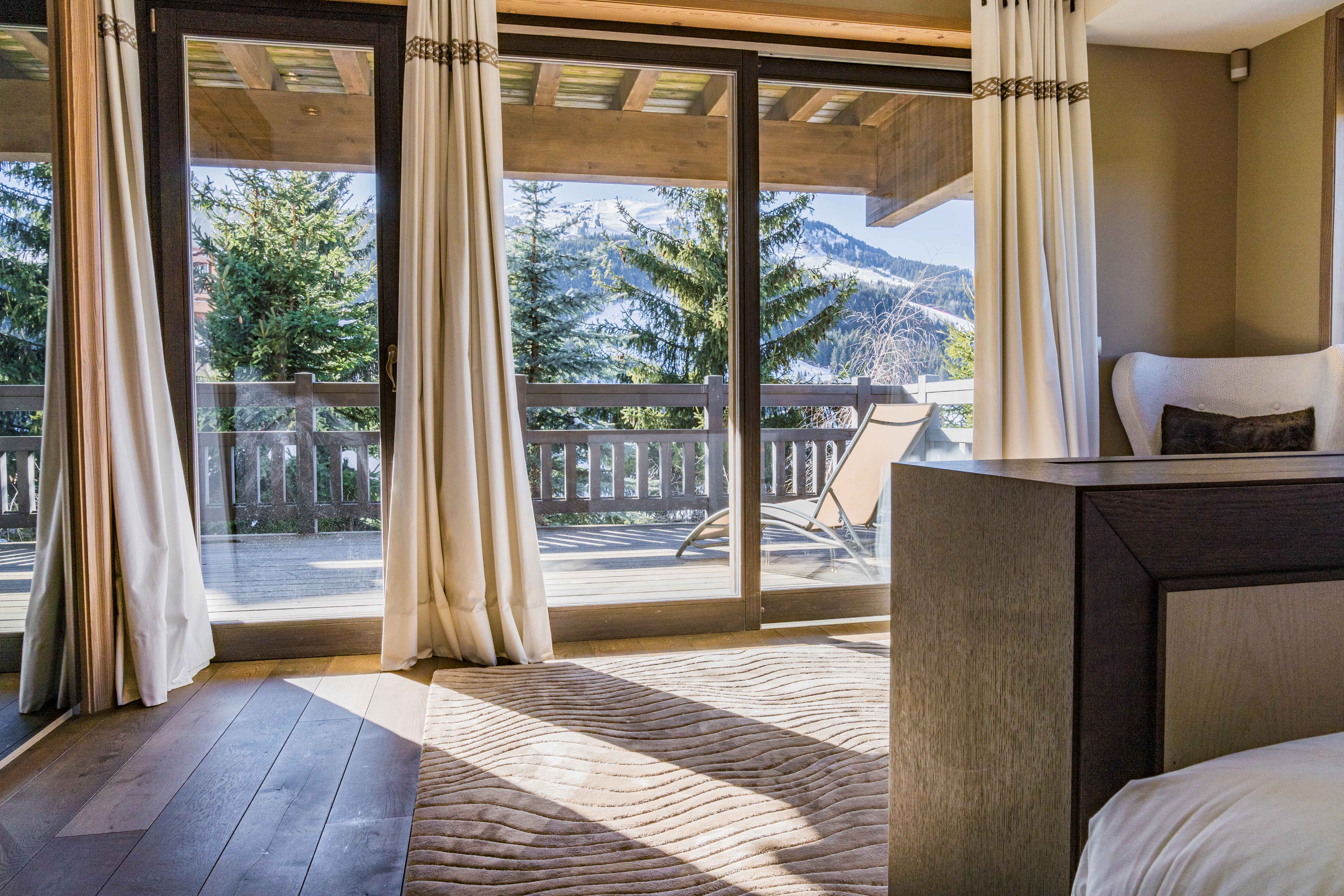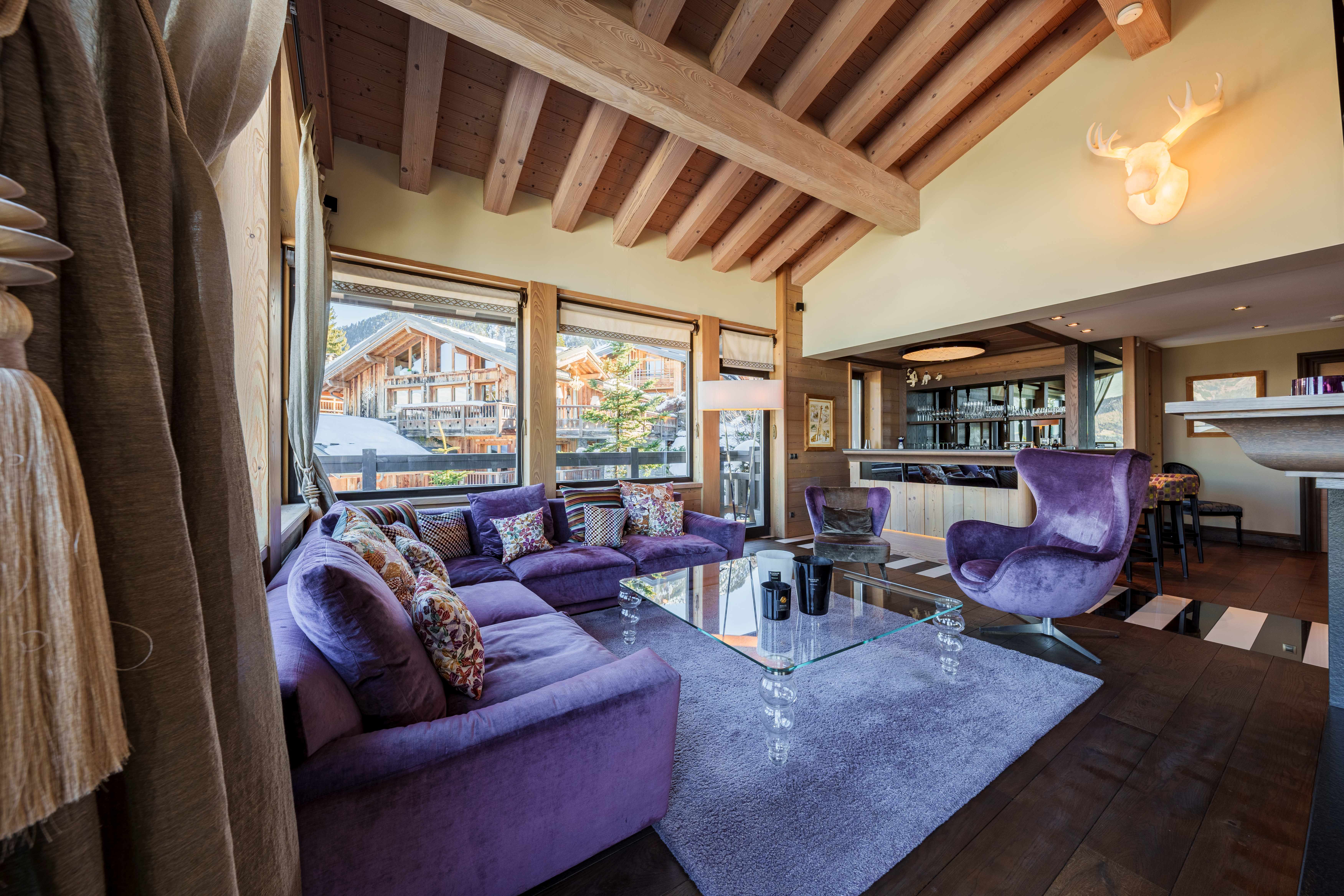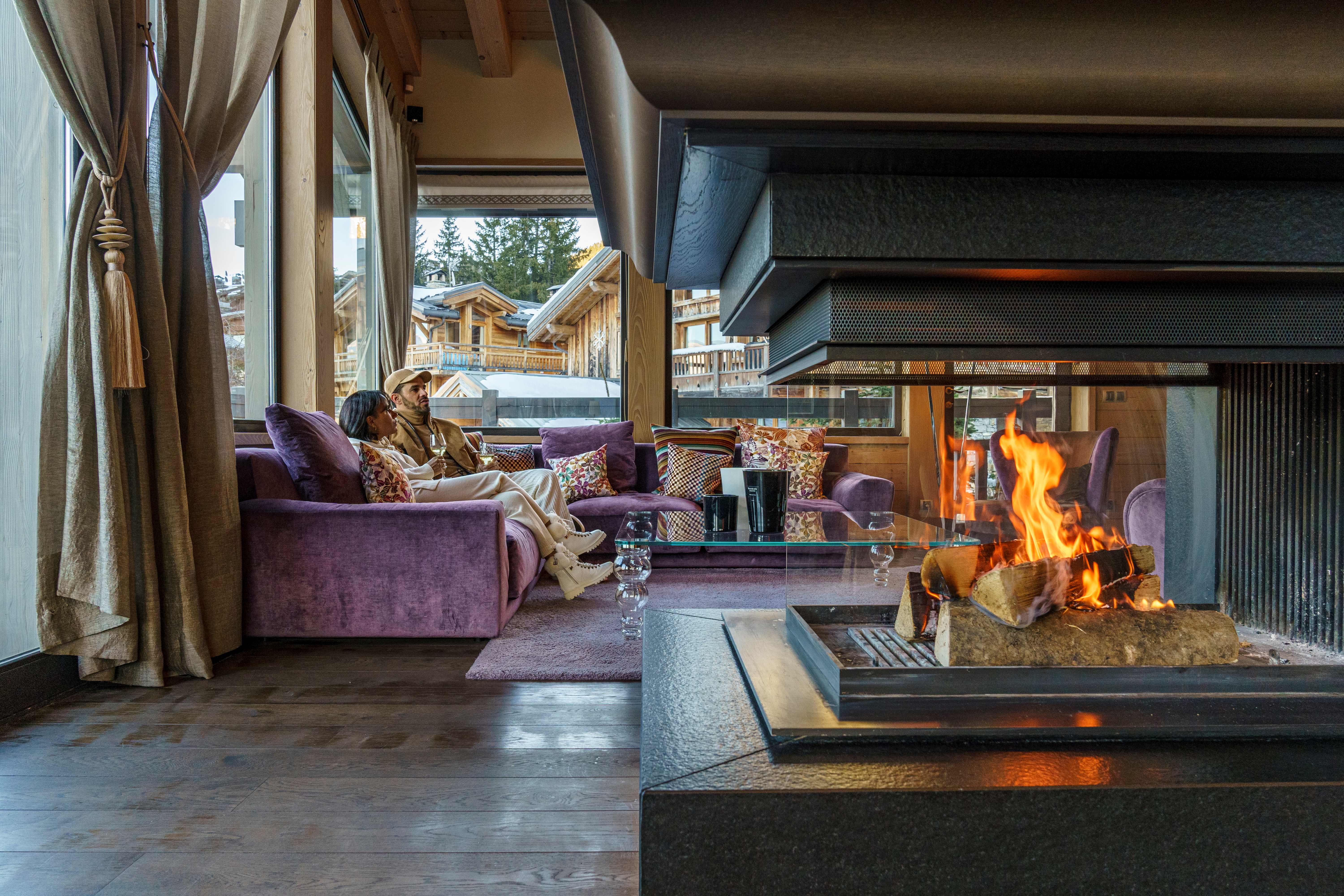 On this level, an expansive living area flows into a cozy double lounge, where a central fireplace fosters a welcoming ambiance, complemented by a television that enhances comfort. The large bay windows provide a stunning view of the valley and the enchanting spectacle of the setting sun, illuminating the room with natural light. A bar area, adorned with a wine cellar, encourages relaxation and conviviality. The fully equipped professional kitchen will satisfy culinary enthusiasts. The elegant dining room features a round table that can seat up to 14 guests for unforgettable meals.