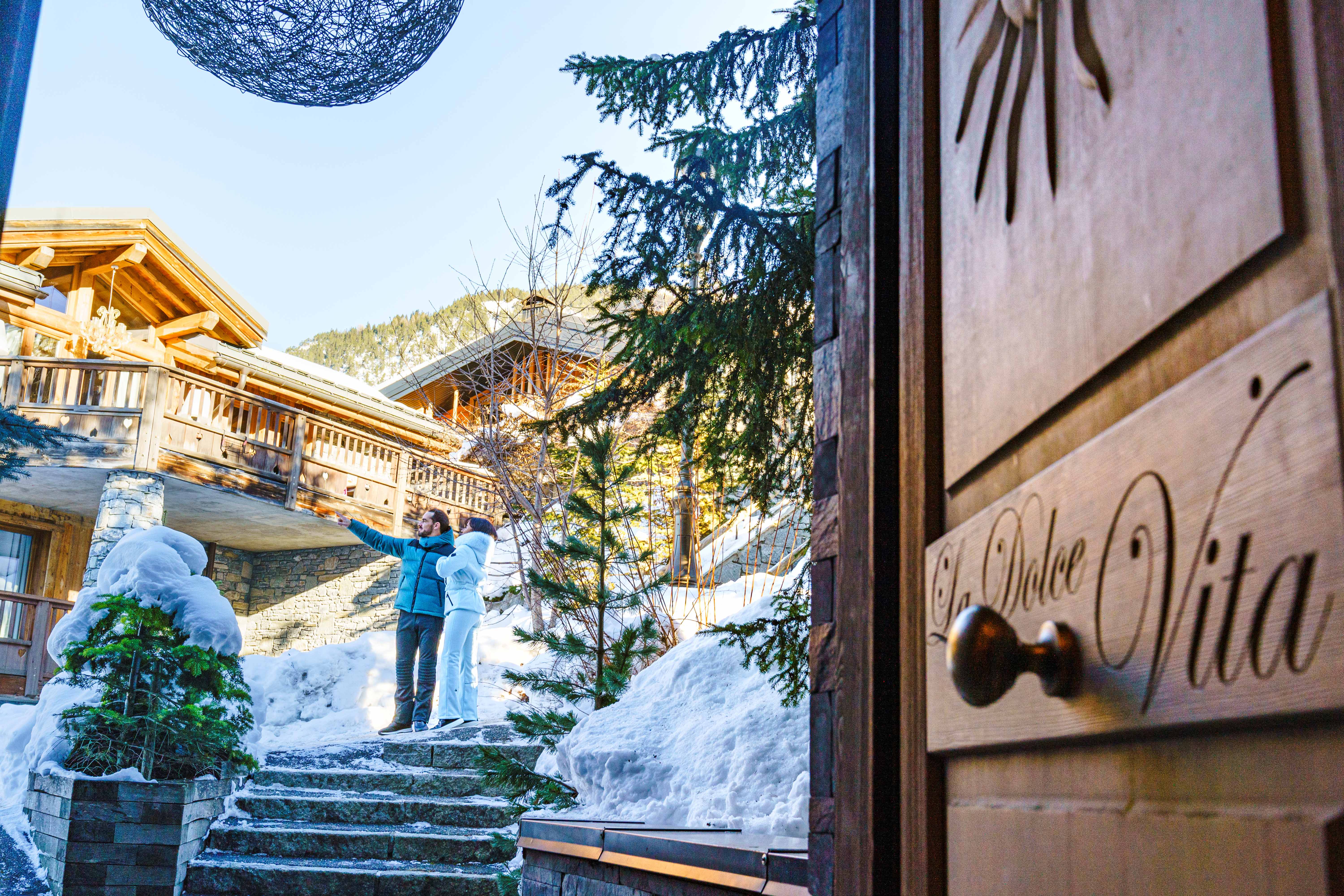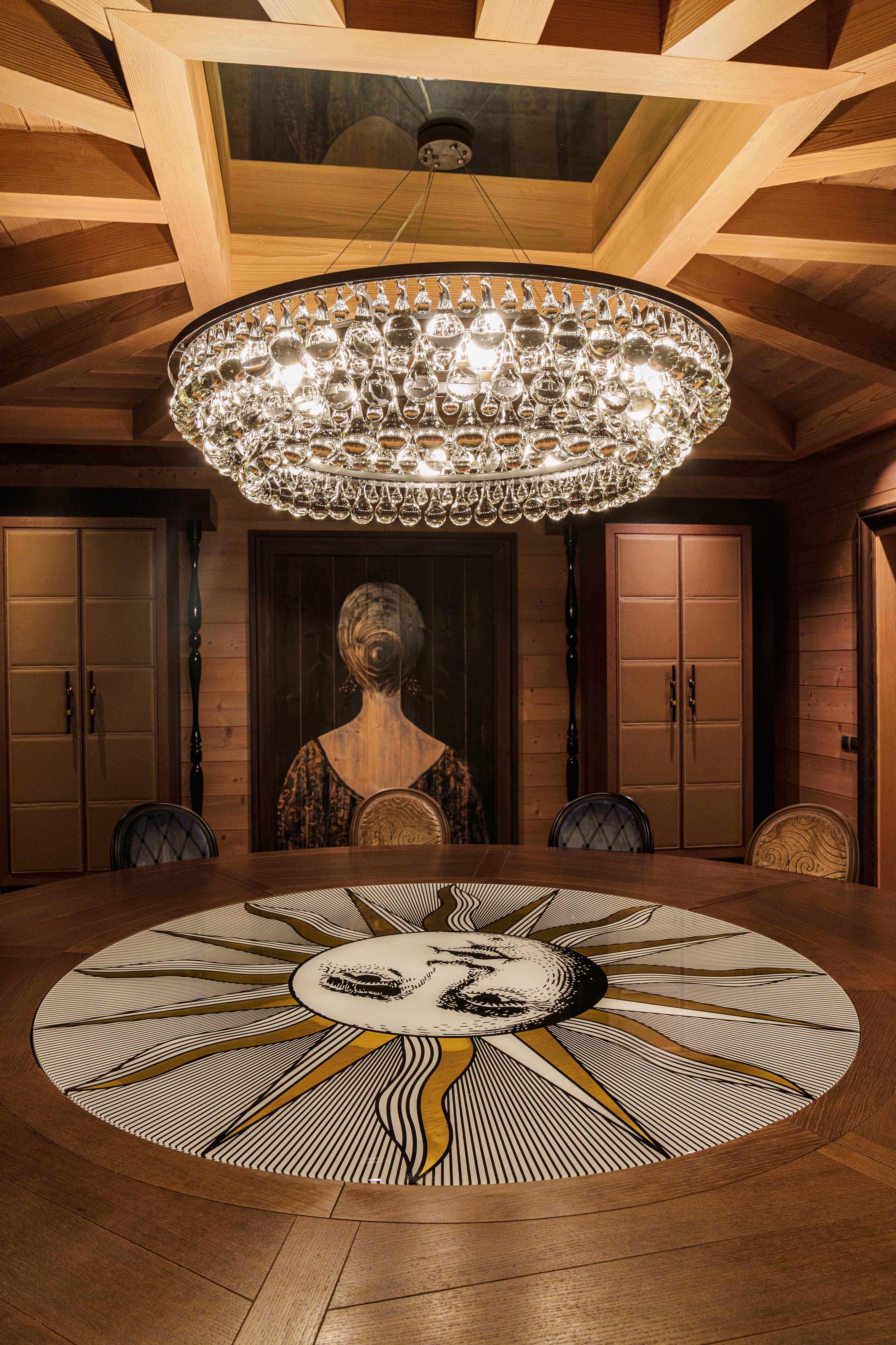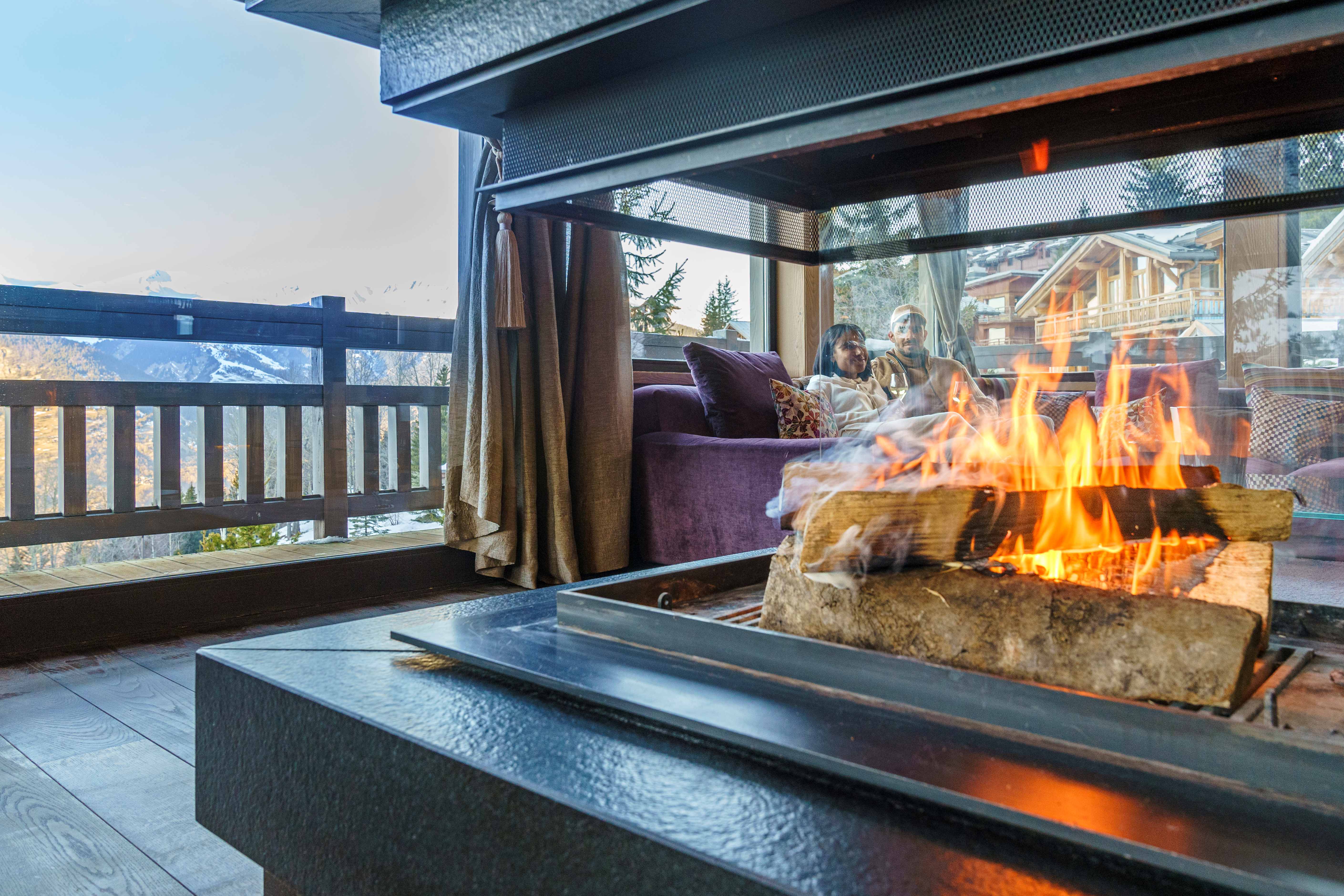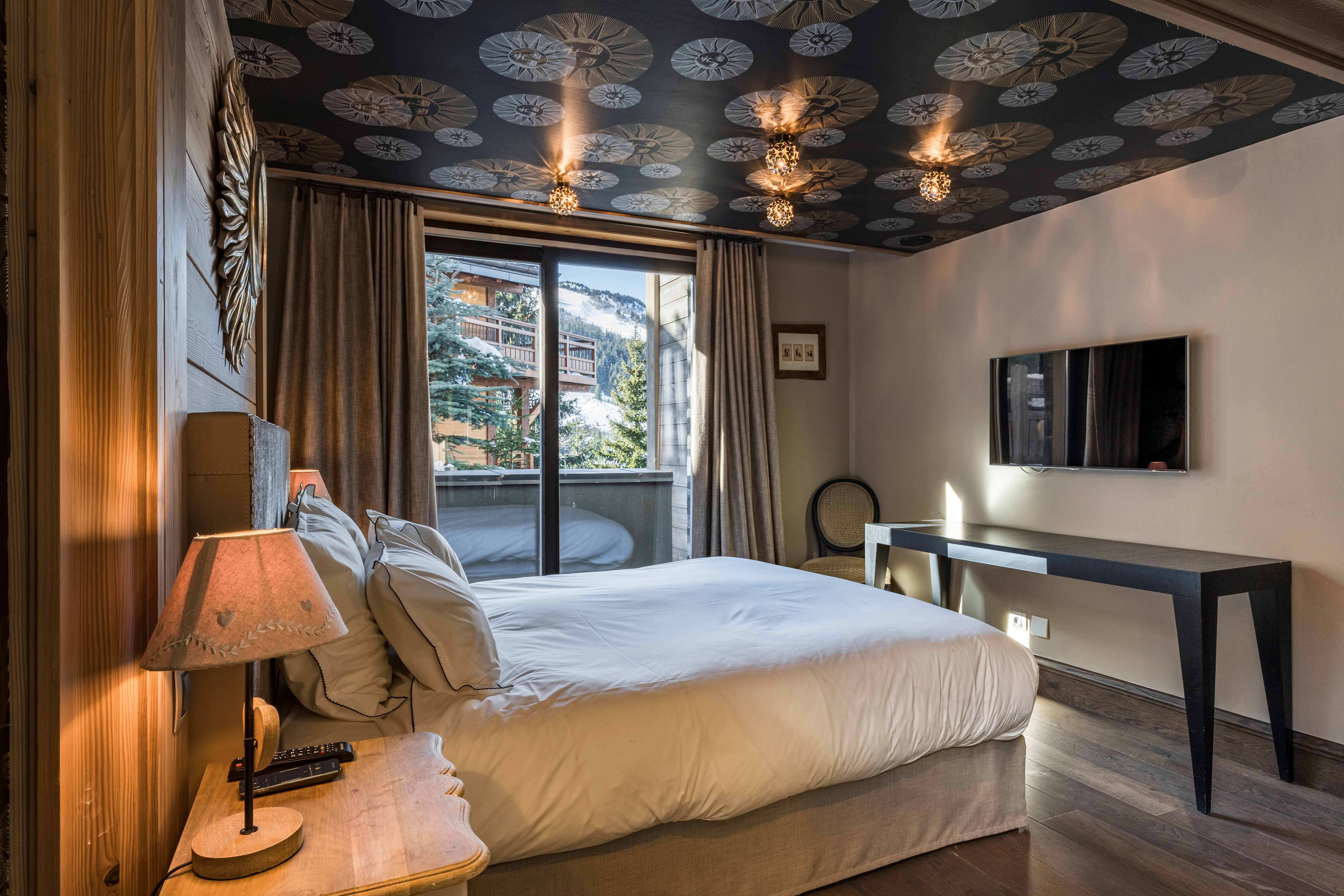 On this level, an expansive living area flows into a cozy double lounge, where a central fireplace fosters a welcoming ambiance, complemented by a television that enhances comfort. The large bay windows provide a stunning view of the valley and the enchanting spectacle of the setting sun, illuminating the room with natural light. A bar area, adorned with a wine cellar, encourages relaxation and conviviality. The fully equipped professional kitchen will satisfy culinary enthusiasts. The elegant dining room features a round table that can seat up to 14 guests for unforgettable meals.