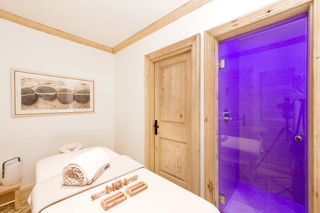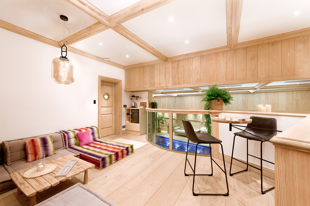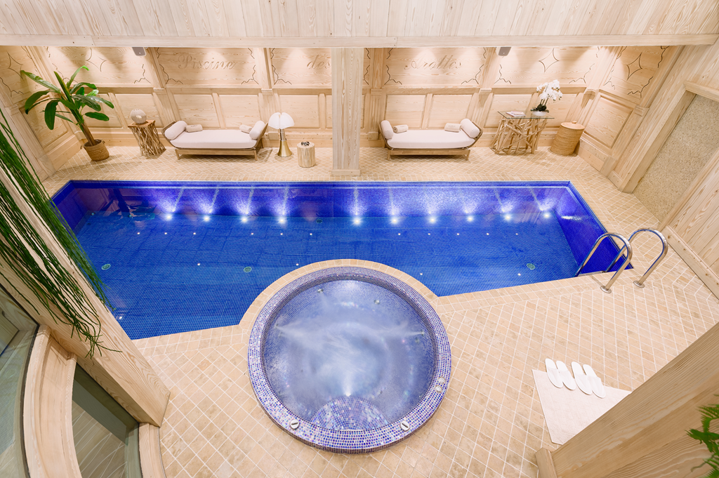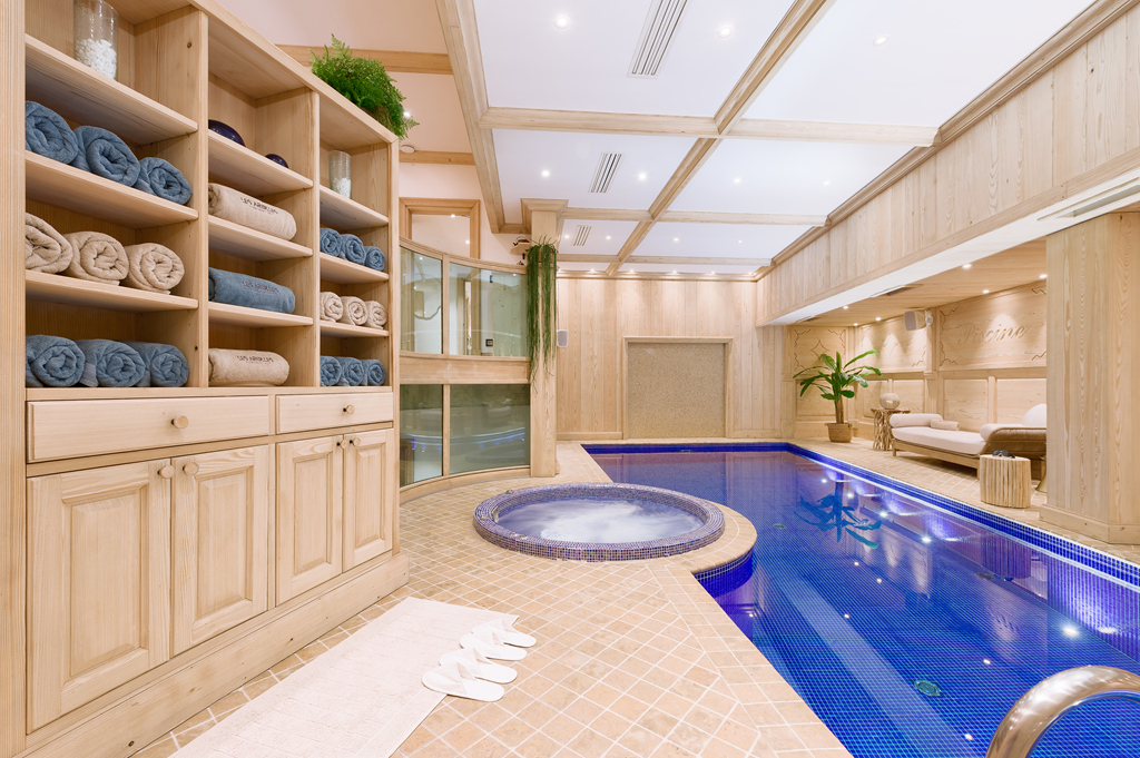 Espace détente : Piscine intérieure, Jacuzzi, douche, salle de fitness, salon détente. Terrasse avec Sauna