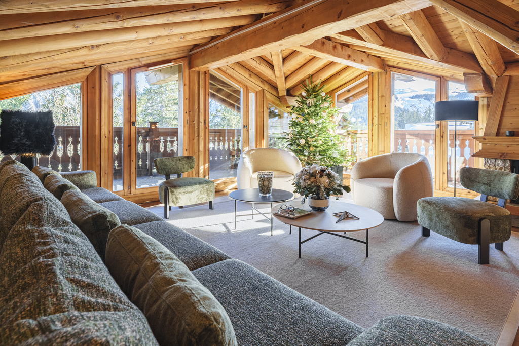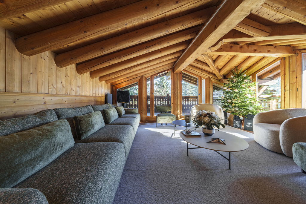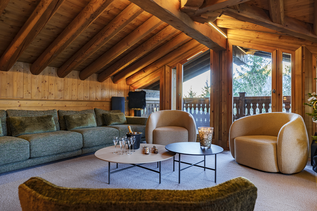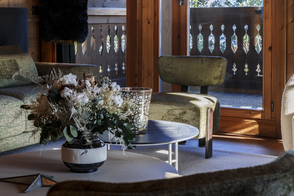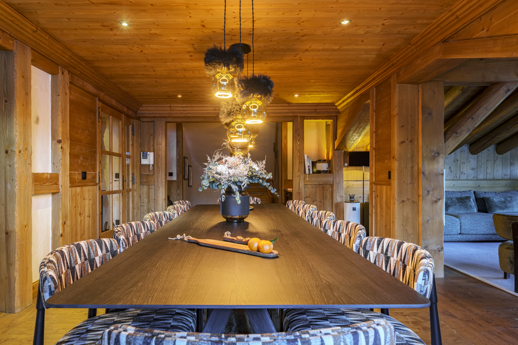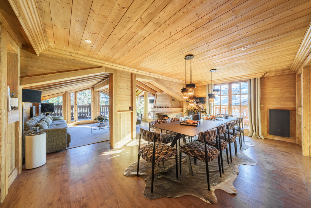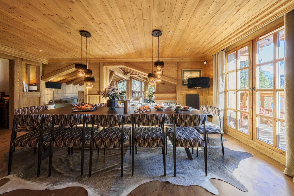 Le grand séjour est un espace convivial qui inclut une salle à manger spacieuse, idéale pour partager des repas en famille ou entre amis. Un coin salon douillet, agrémenté d'une cheminée chaleureuse, invite à la détente après une journée sur les pistes. De grandes baies vitrées offrent une vue imprenable sur les montagnes environnantes, créant une atmosphère apaisante et chaleureuse.