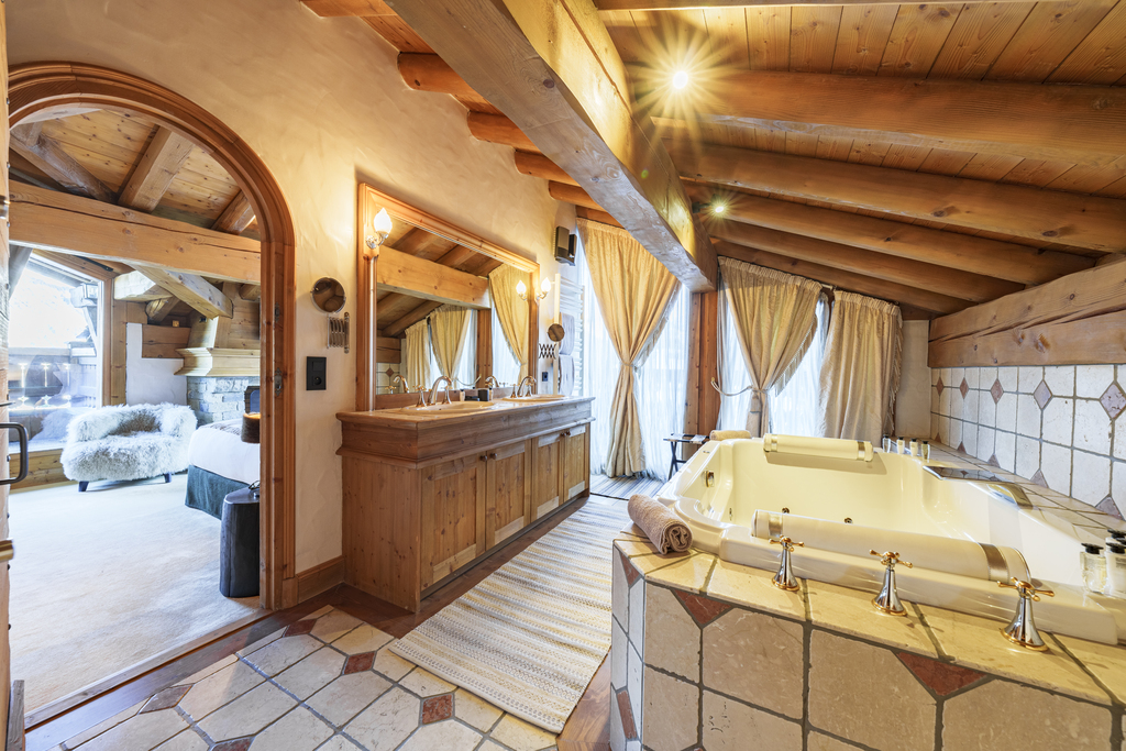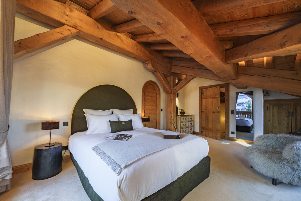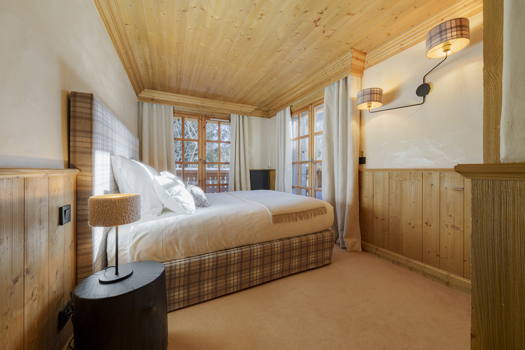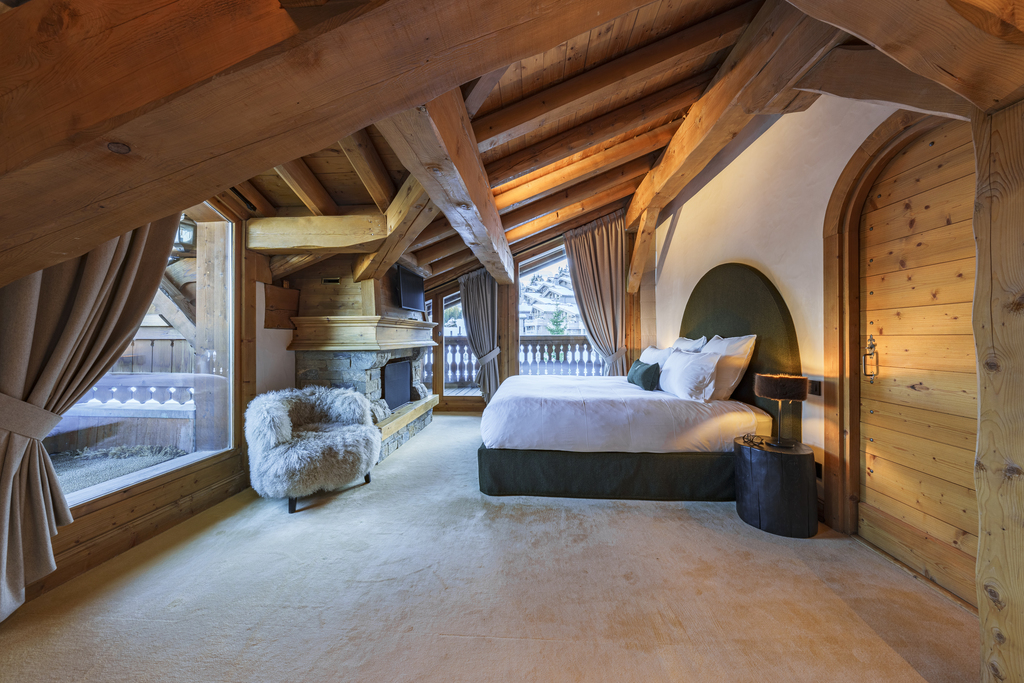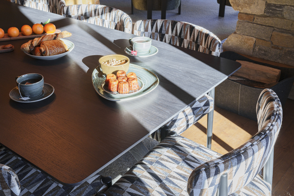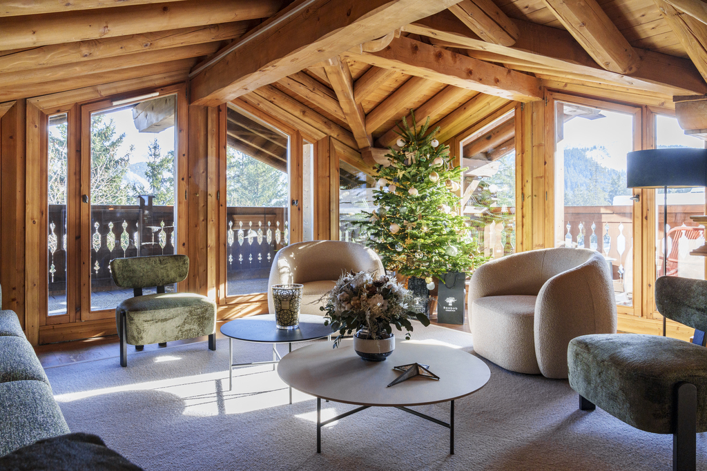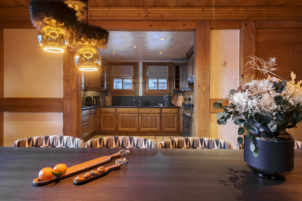 Le grand séjour est un espace convivial qui inclut une salle à manger spacieuse, idéale pour partager des repas en famille ou entre amis. Un coin salon douillet, agrémenté d'une cheminée chaleureuse, invite à la détente après une journée sur les pistes. De grandes baies vitrées offrent une vue imprenable sur les montagnes environnantes, créant une atmosphère apaisante et chaleureuse.