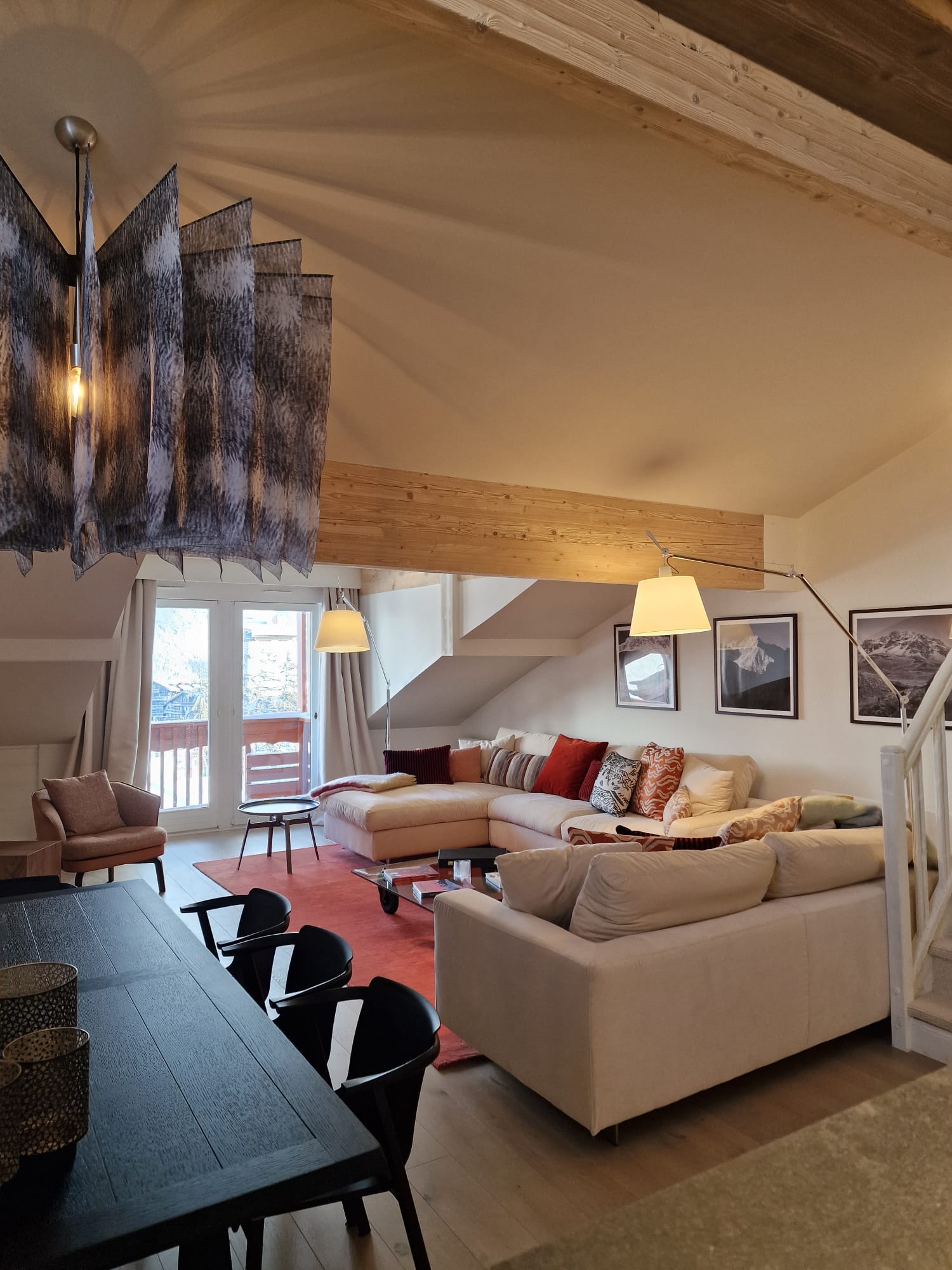 Depuis le séjour, le balcon dévoile une vue à couper le souffle sur les montagnes et la vallée.
